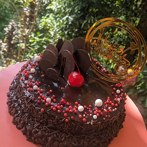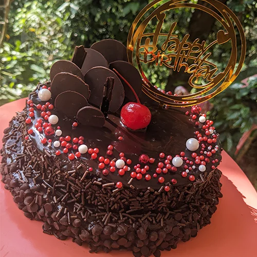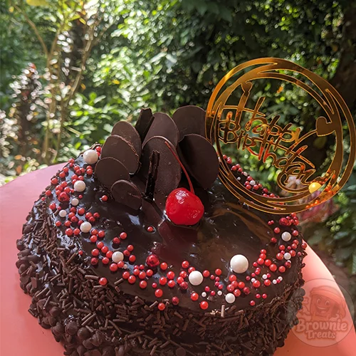 The top is decorated with chocolate chips, cherries, and chocolate biscuits, adding extra flavour and a lovely homemade look. It’s a perfect choice for birthdays or for anyone who loves the deep, satisfying taste of real brownies. Freshly baked and full of chocolate goodness, this cake makes your celebration sweet and memorable.