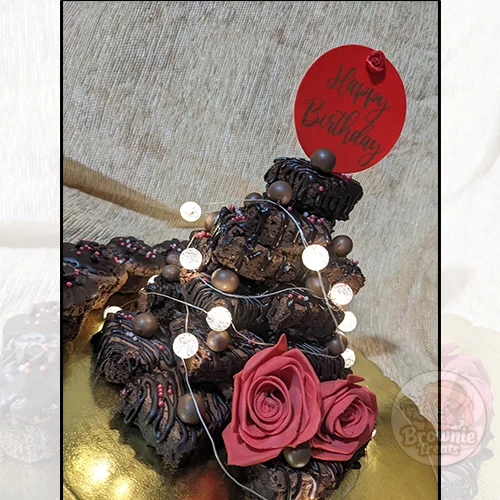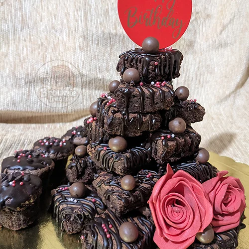 Make your special occasions unforgettable with our Brownie Tower Birthday Cake. This unique cake is made entirely from rich, fudgy brownie pieces, each around 2 inches in size. Every piece is carefully stacked one by one to create a tall, eye-catching tower that is both beautiful and delicious.